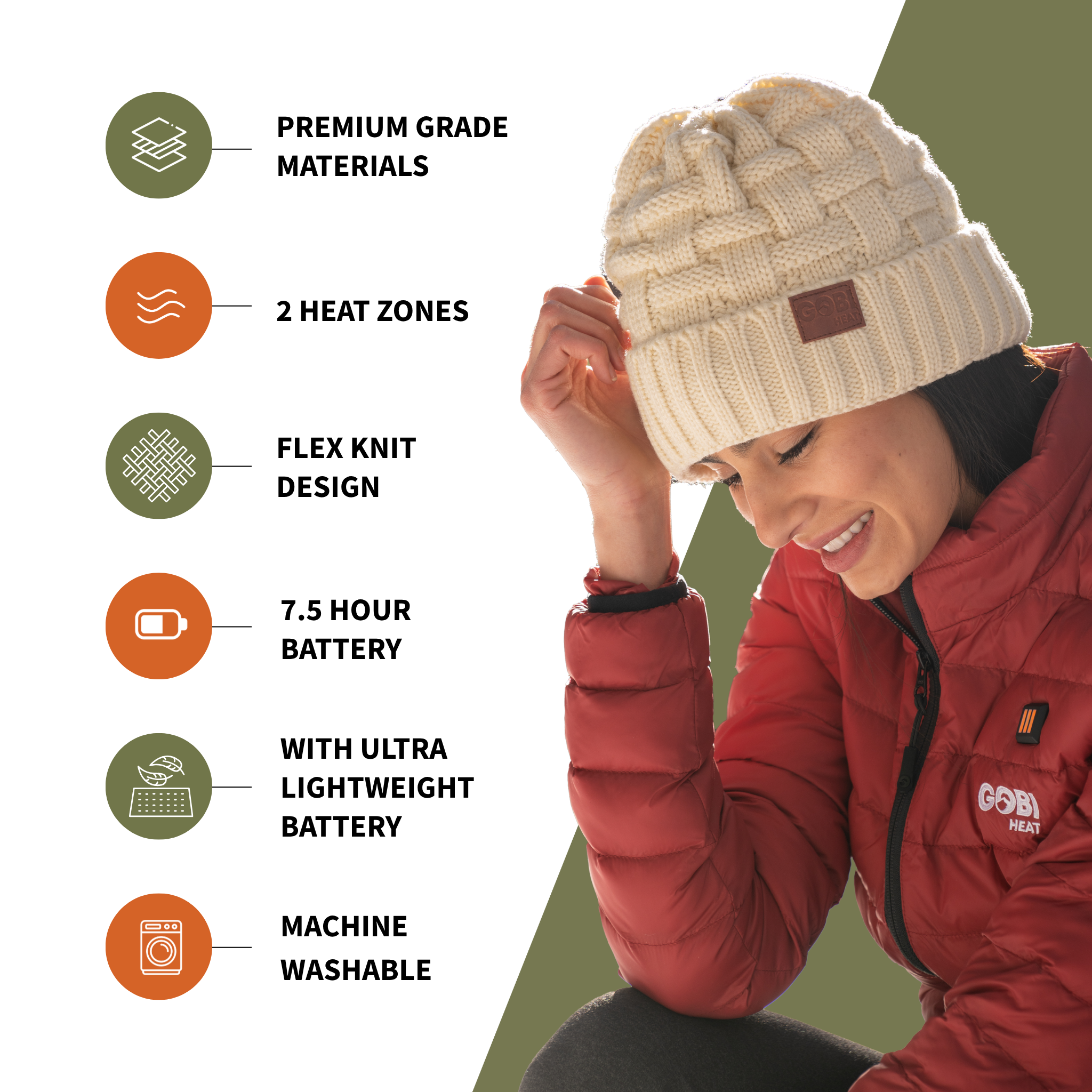Our polyester & spandex womens knit beanie can power your warmth for up to 7.5 hours! Activate the over ear dual steel fiber tech heating areas, across 3 temperature settings, with our one touch led controller. This durable heated womens beanie with 100% acrylic fiber interior is machine washable as well! Don’t let the winter cold stop you from doing the things you love!