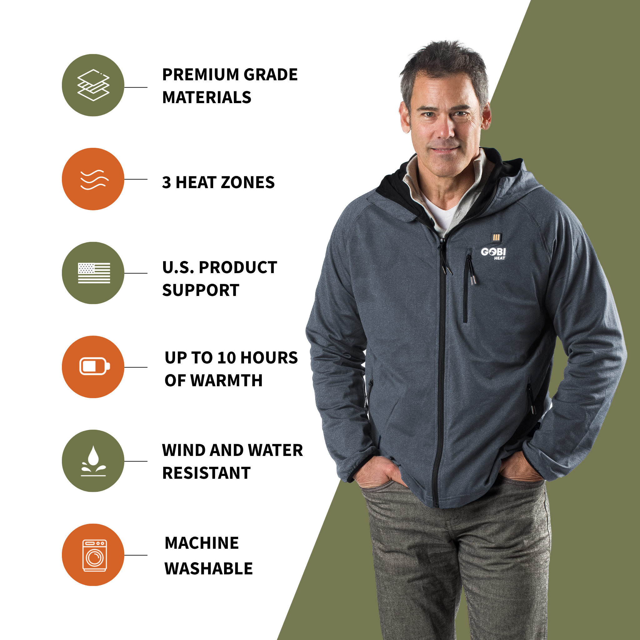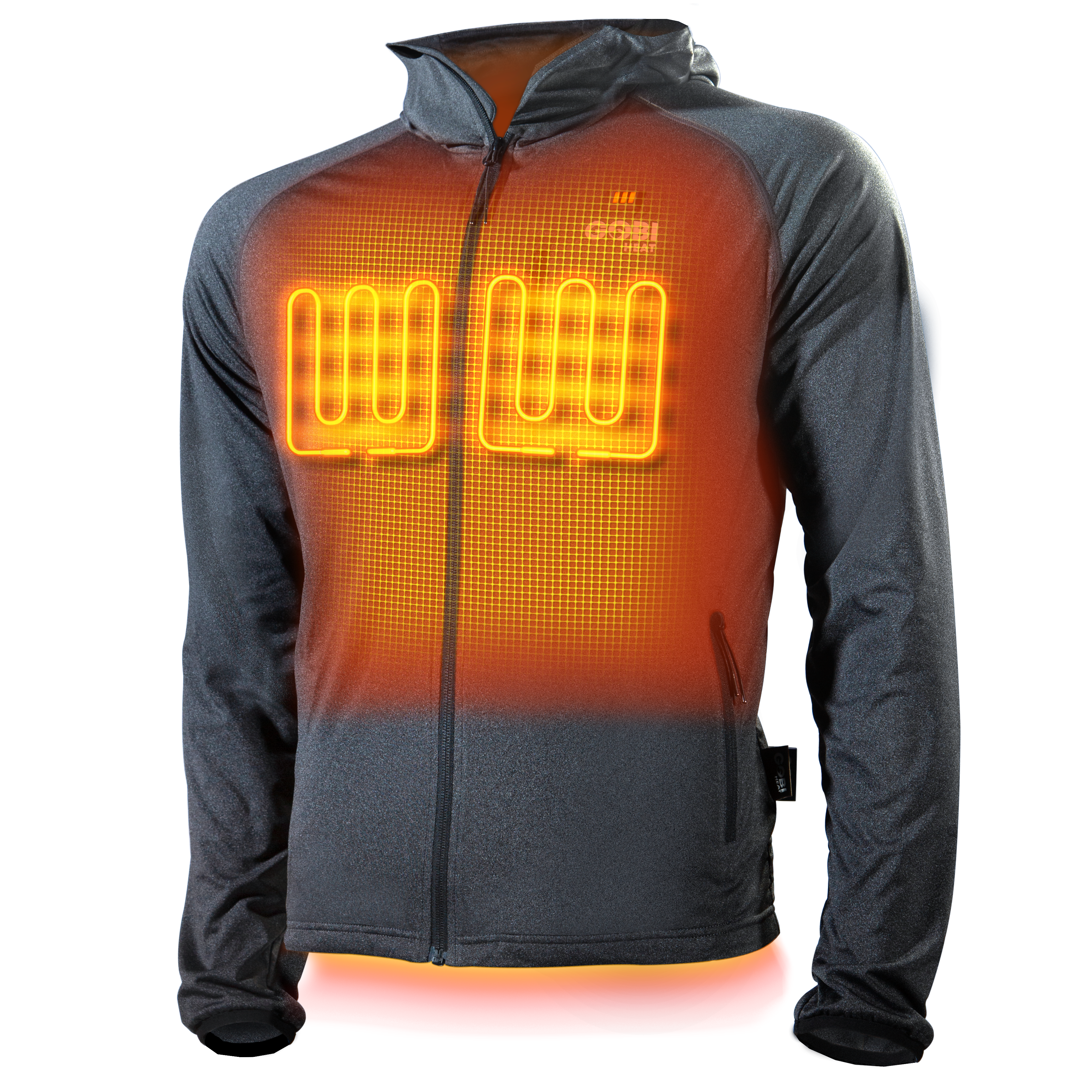 The Apex Heated Tech Hoodie is Gobi Heat’s trendiest heated jacket yet. Featuring a full-zip design and a flexible, lightweight fabric, the Apex tech hoodie brings you warmth wherever your day takes you. This heated lightweight hoodie is battery powered and contains our premium and efficient conductive thread heat system. Featuring three customizable levels of heat, you take control of your comfort and set the jacket to the heat setting you desire. We are excited to offer our premium heated jacket in two colors, Coal Black and Ocean Blue. Stay dry, warm and comfortable without the restraints of a stiffer fitting jacket. New Quick-Charge Multi-Voltage Battery!