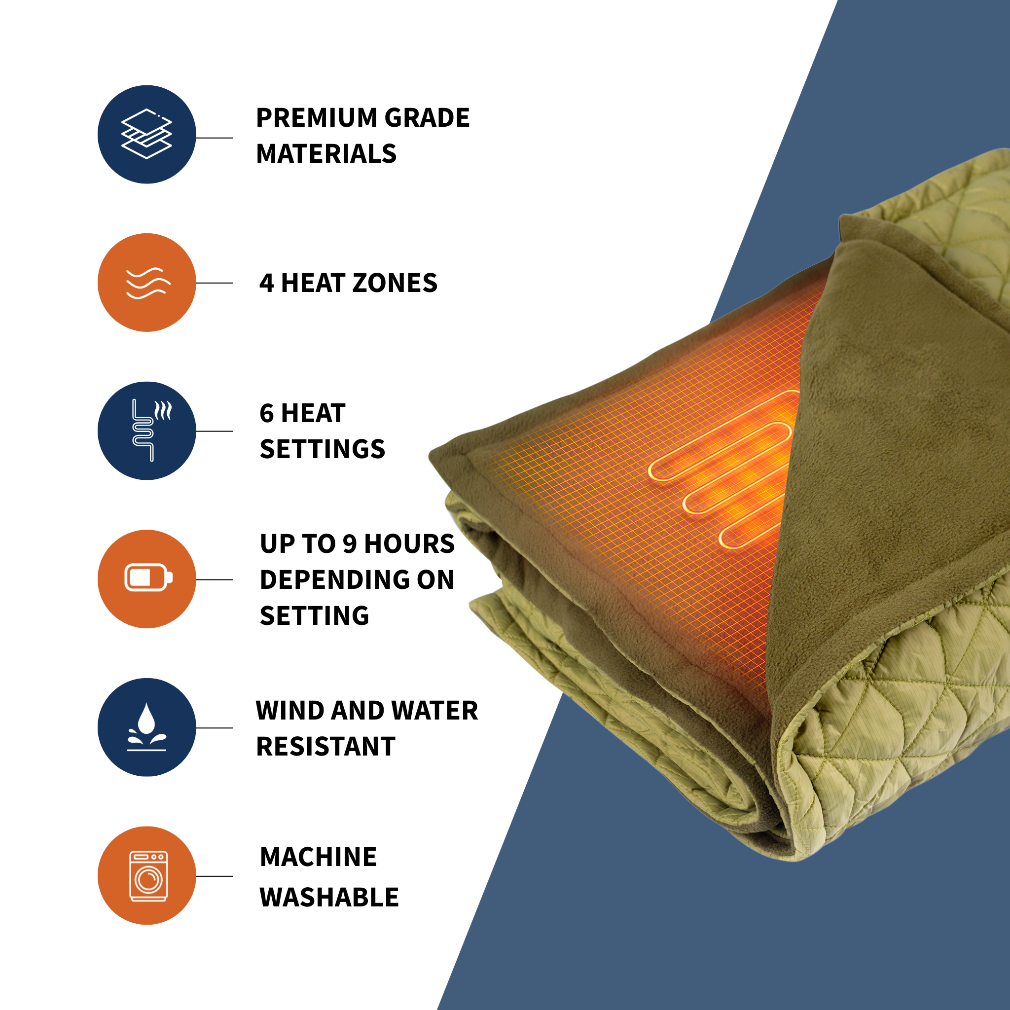 This portable heated blanket combines the comfort of a premium quilted throw with the freedom of a hands-free wrap — powered by Gobi’s reliable heating technology. With 4 independent heating zones and dual-button controls, you can choose front-only, back-only, or full-coverage warmth. Perfect as a camping heated blanket, a stadium blanket for sports, or a cozy travel heated blanket at home or on the road. The included universal power kit gives you unmatched flexibility: plug into the rechargeable Gobi Heat® battery, a wall outlet, or your vehicle’s 12V socket. That means all-day warmth, indoors or outdoors, wherever life takes you. 🔌🔋