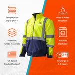 Built from wind- and water-resistant polyester with a soft nylon lining, this jacket is ANSI Class III certified for visibility. It features bold 5 cm reflective tape across key zones and a 3-bar LED indicator so you always know your heat setting.